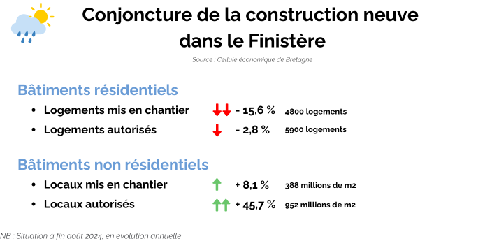 A fin août 2024, par rapport aux 12 mois précédents, le nombre de logements commencés dans le Finistère est de 4800, soit -15,6% en évolution annuelle. Néanmoins, cette baisse se tasse, comme en témoigne les autorisations de construire (-2,8 % dans le Finistère). En regardant dans le détail, c’est le collectif qui porte la dynamique, la situation restant fortement dégradée côté maison individuelle.