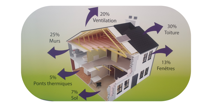 Sébastien Deniel nous a expliqué les différents postes de déperdition d’énergie d’un habitat sur lesquels l’entreprise est susceptible d’intervenir et d’apporter une réponse au client (schéma ci-dessous). Il souligne en premier lieu l’importance de l’isolation (toiture, mur, plancher). Un investissement qui peut être vite amorti, au regard notamment de l’augmentation des coûts de l’électricité.